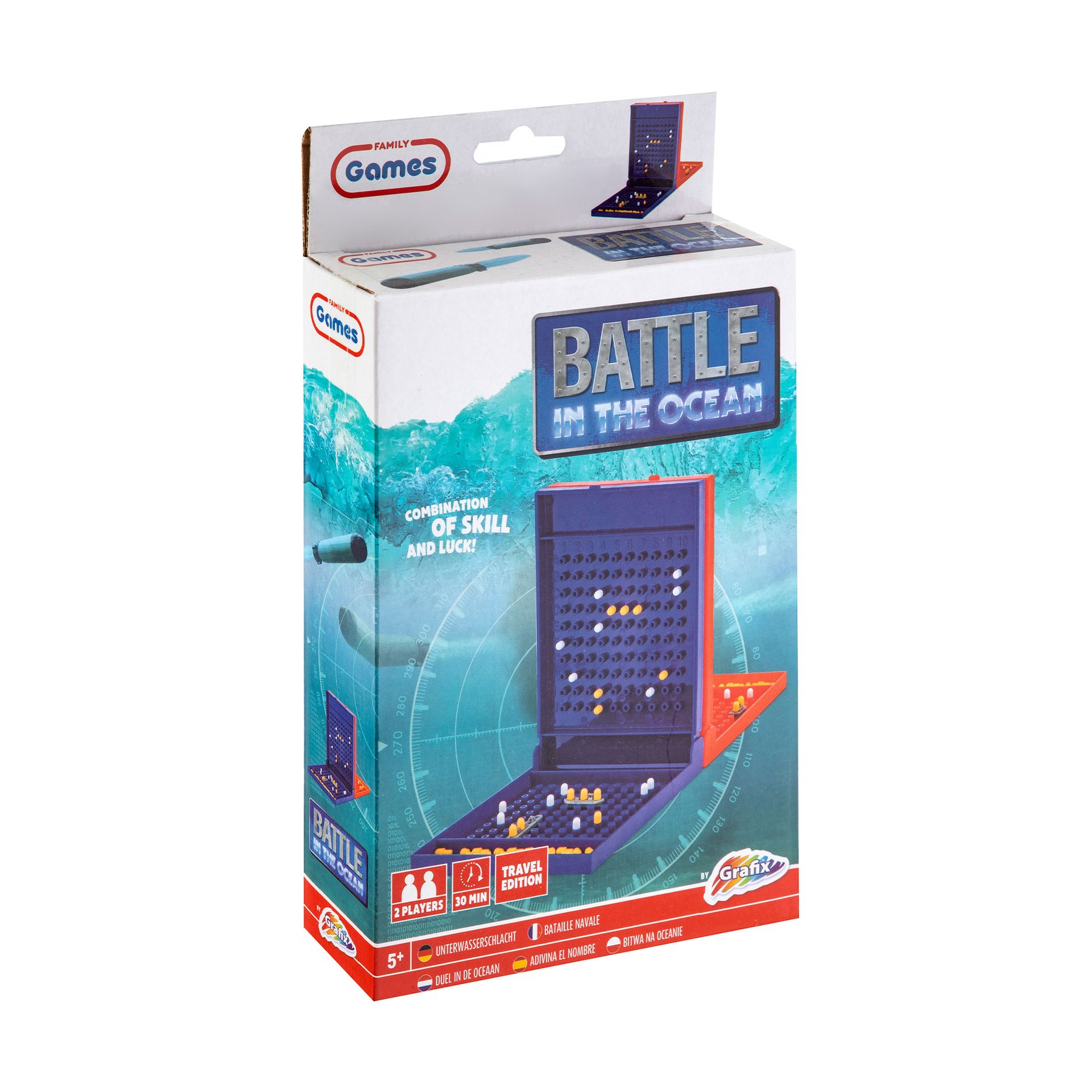 • Играта съдържа 1 сгъваем борд, 10 бойни кораба, жълти и бели маркери и инструкции.