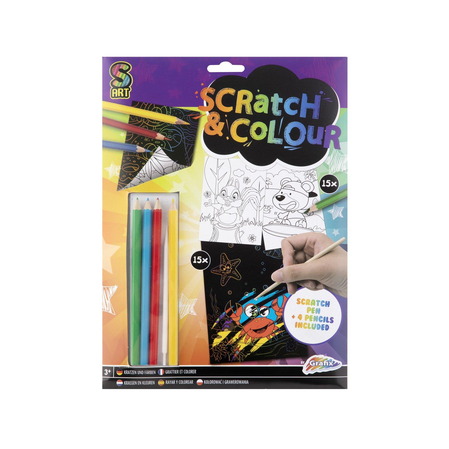 • С помощта на молива-длето, включено в комплекта, открийте под черната повърхност красивите цветове!