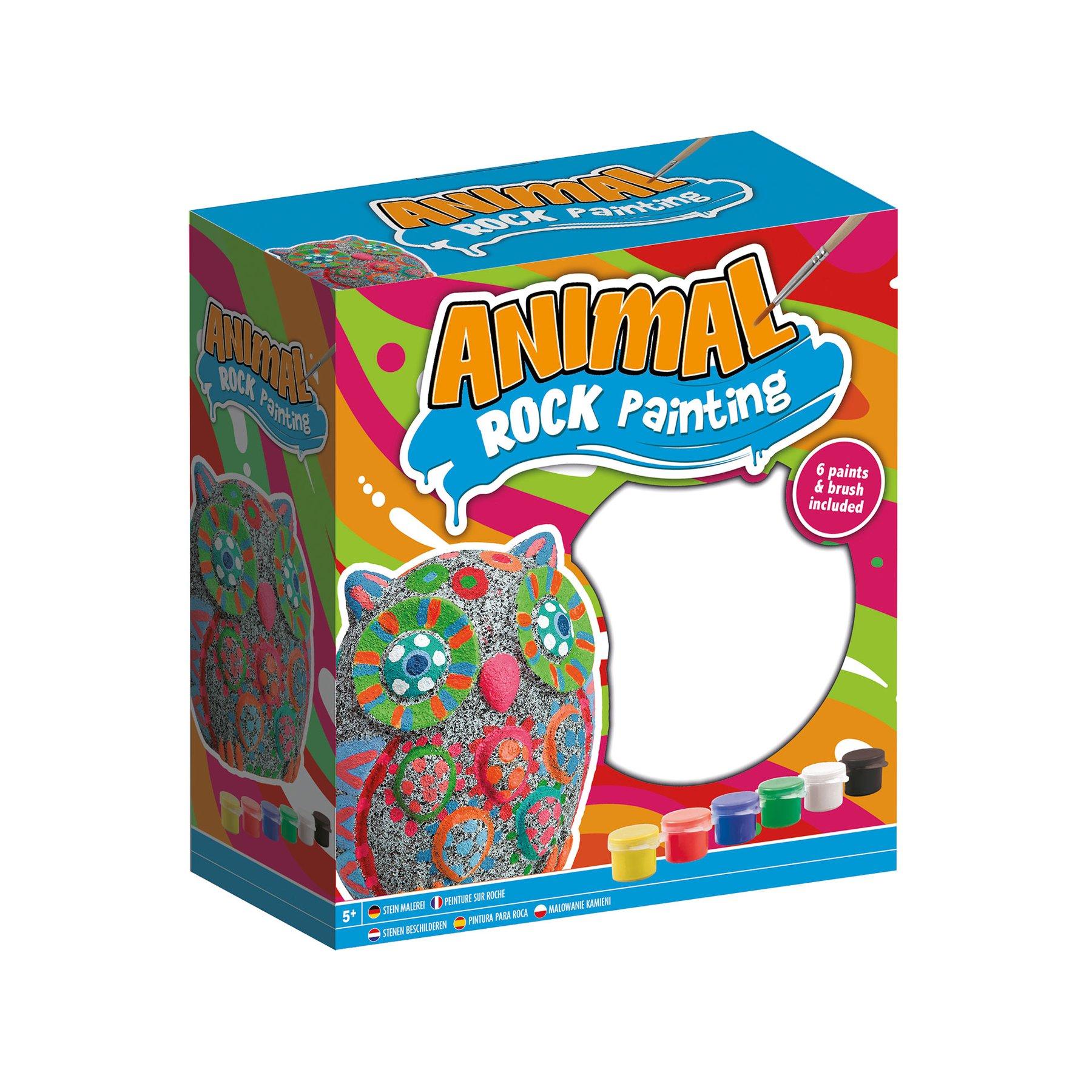 • Комплектът включва камък за рисуване във формата на бухал, 6 цветни бои и четка.