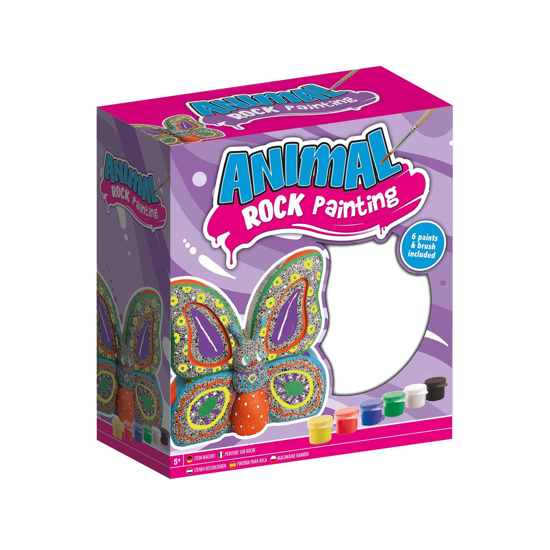 • Комплектът включва камък за рисуване във формата на пеперуда, 6 цветни бои и четка.