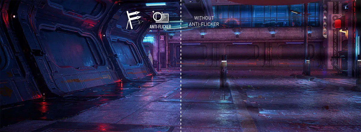 Anti-Flicker and Less Blue Light technologies provide a very comfortable viewing experience by reducing the amount of flicker and displaying lower levels of blue light. You can game for longer periods without experiencing eye fatigue.