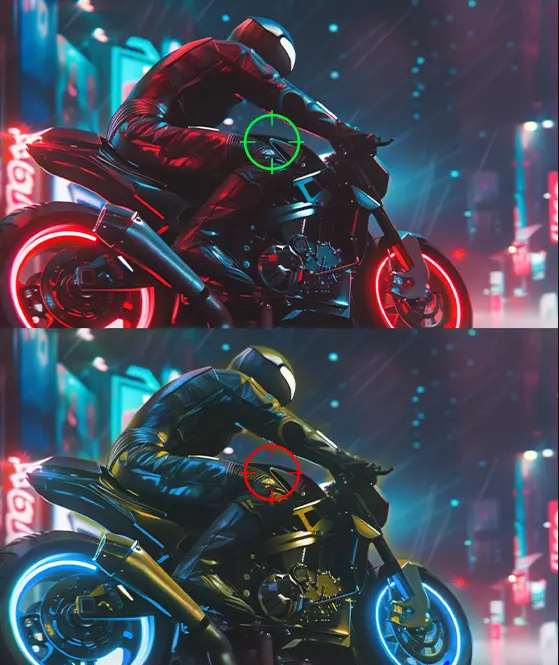 Smart crosshair The aim dot automatically changes color, making it visible at any time. If the color of the aim dot verlaps with the background color, it will be problematic for aiming. | AI Vision The new AI Vision technology can not only reveal details in dark areas but also enhance overall brightness and saturate colors, bringing brightness to your day. |