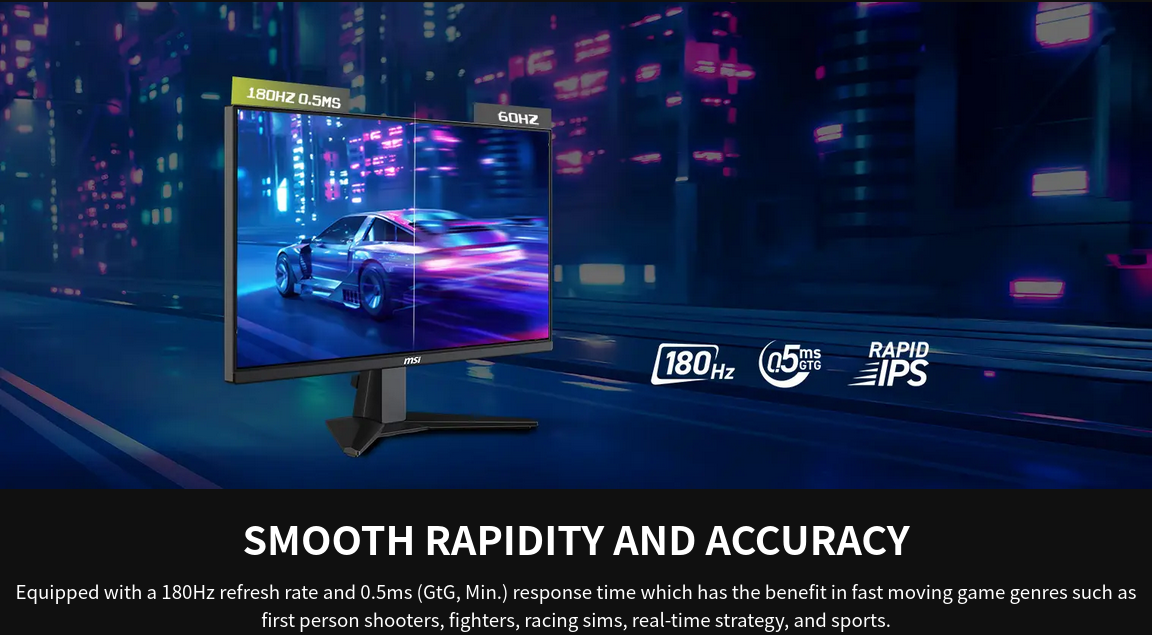 - Rapid IPS Panel – Provides 0.5ms (GtG, Min.) response time, optimizes screen colors and brightness.
