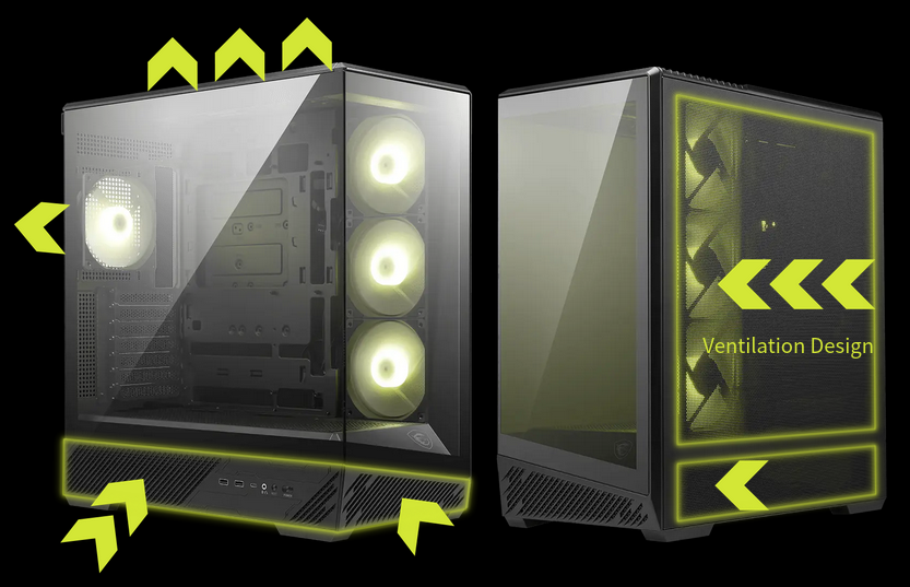![]() | Panoramic Display To fulfill the desire for showcasing an ARGB PC build, the MAG PANO 130R Series features a 270-degree panoramic display, enhancing aesthetics and maintaining a clean design. |