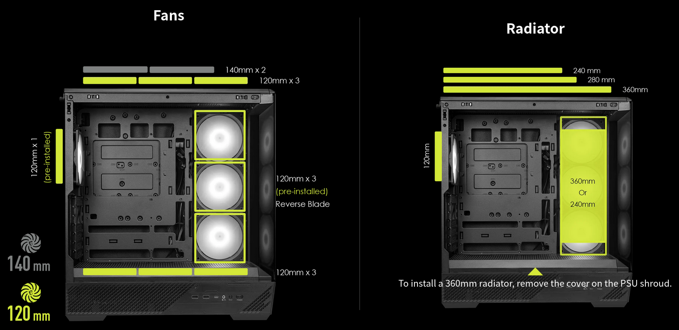 Side: 3 x 120 mm ARGB Fan (Reverse Blade Fan)