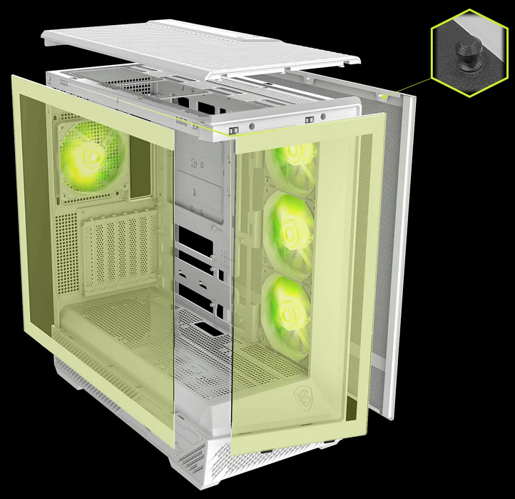 ![]() | Toolless removable glass panels Screwless mounting and tool-free removable panel design on both sides allow for greater setup flexibility. |