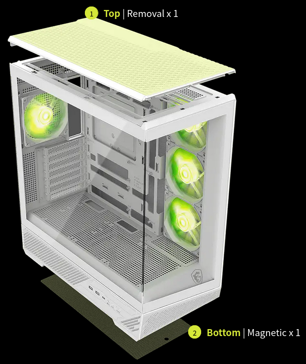 ![]() | Dust protection A magnetic dust filter is installed on the bottom of the case, while a removable filter covers the bottom vents - both designed to prevent dust buildup and allow for easy cleaning. |