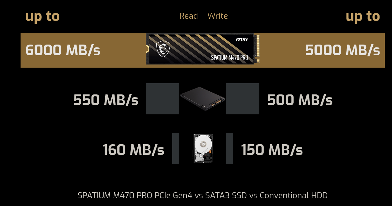 Optimized for the PCIe Gen4 interface, SPATIUM M470 PRO SSD reaches read/write speeds up to 6000/5000 MB/s, allowing for rapid data transfer and shortened game load times.