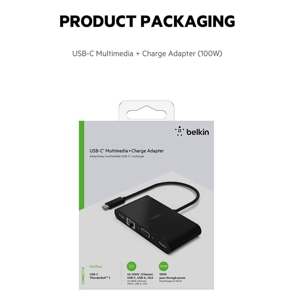 Мултифункционален адаптер за свързване от USB-C към Ethernet, HDMI, VGA и USB-А 3.0 - Belkin USB-C Multimedia Plus Charge Adapter (черен)