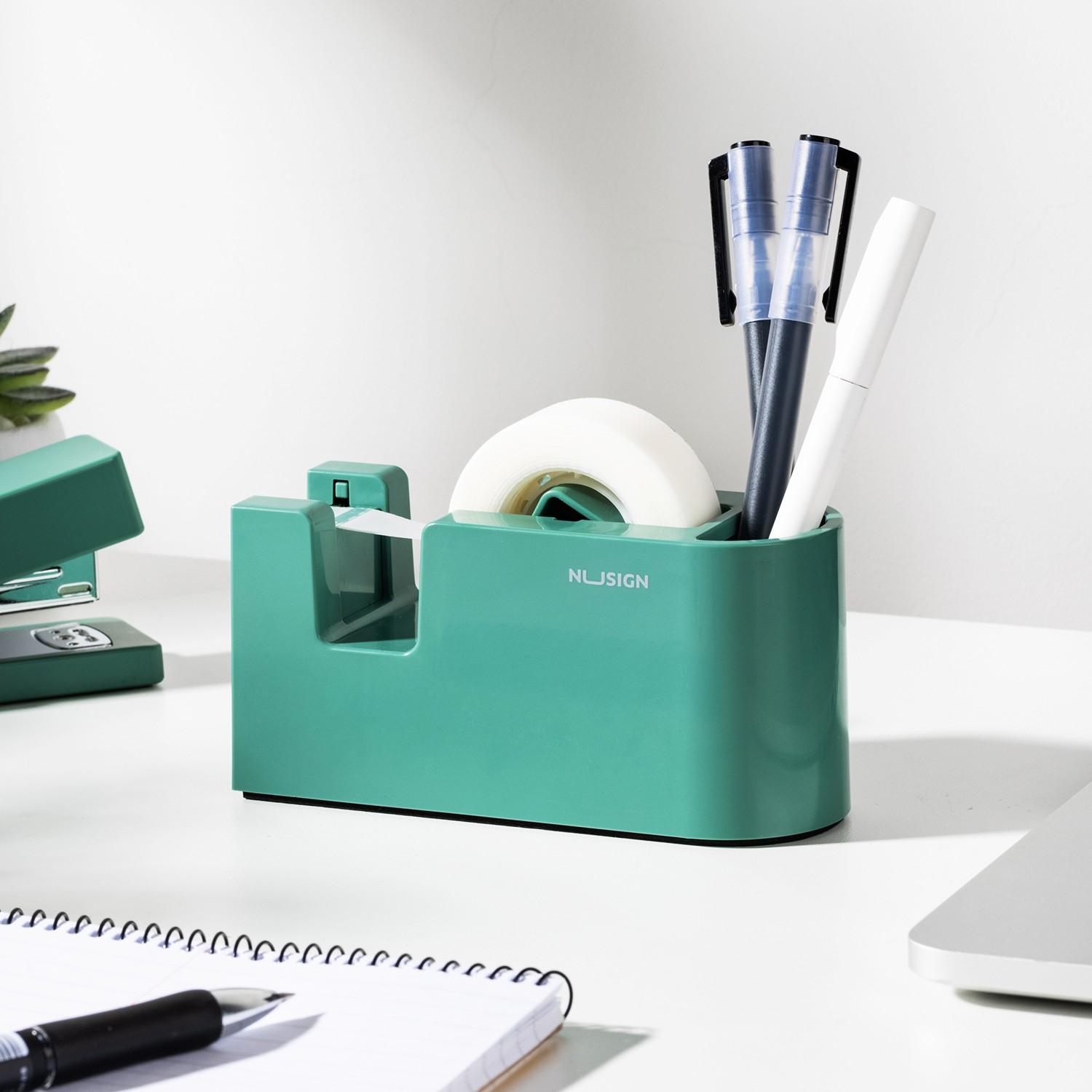 Настолен тиксодържач с моливник NuSign ENS123, 134x52x64 мм, за ленти до 21 мм х 33 м, зелен