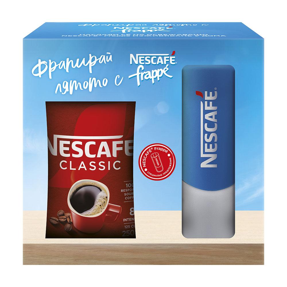 Съдържа метална кутия NESCAFE® Classic 250g за 62 чаши освежаващо NESCAFE® FRAPPE, както и шейкър, с който да си го приготвиш.