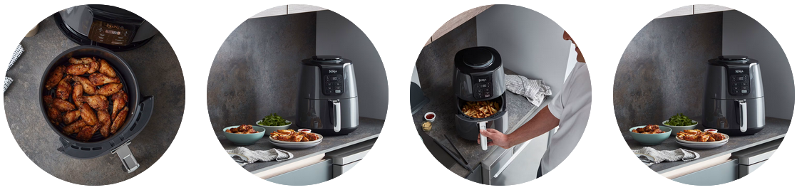 До 75% по-малко мазнини* По-здравословен начин да се насладите на любими пържени ястия. До 75% по-малко мазнини* от традиционните методи на пържене. Насладете се на същия фантастичен вкус, но приготвен с малко или никакво олио. *в сравнение с ръчно нарязани, пържени пържени картофи | До 50% по-бързи от конвекционните фурни Подгответе храната на масата до два пъти по-бързо, отколкото с традиционна фурна, като готвите по-бързо и по-равномерно благодарение на автоматичния вентилатор и прецизните настройки на температурата. | 4 функции за готвене Благодарение на лесното управление, избирайте между пържене на въздух, печене, претопляне и сушене, за да приготвите вкусни основни ястия, гарнитури и закуски. Можете дори да приготвите замразените си съставки с бързи и вкусни резултати. | Бързо и лесно Този лесен за употреба фритюрник с горещ въздух има капацитет от 3,8 литра, което побира 1,35 кг пиле или 900 г пържени картофи. Всички подвижни части имат незалепващо покритие и могат да се мият в съдомиялна машина. |