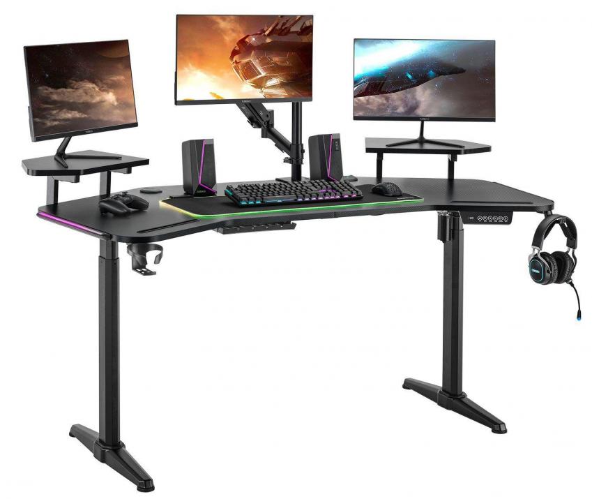 Край на безпорядъка на бюрото ви! От двете страни на плота има функционални отвори, така че можете да поставите оборудването си на бюрото точно както искате, без разхвърляни кабели. Бюрото е оборудвано и с държач за слушалки, който решава проблема какво да правите с тях, когато ги свалите от главата си и поставка за чаша, за да избегнето разливане на течности върху оборудването си. Освен това има и две функционални поставки за допълнителни монитори, които са повдигнати от височината основния плот.