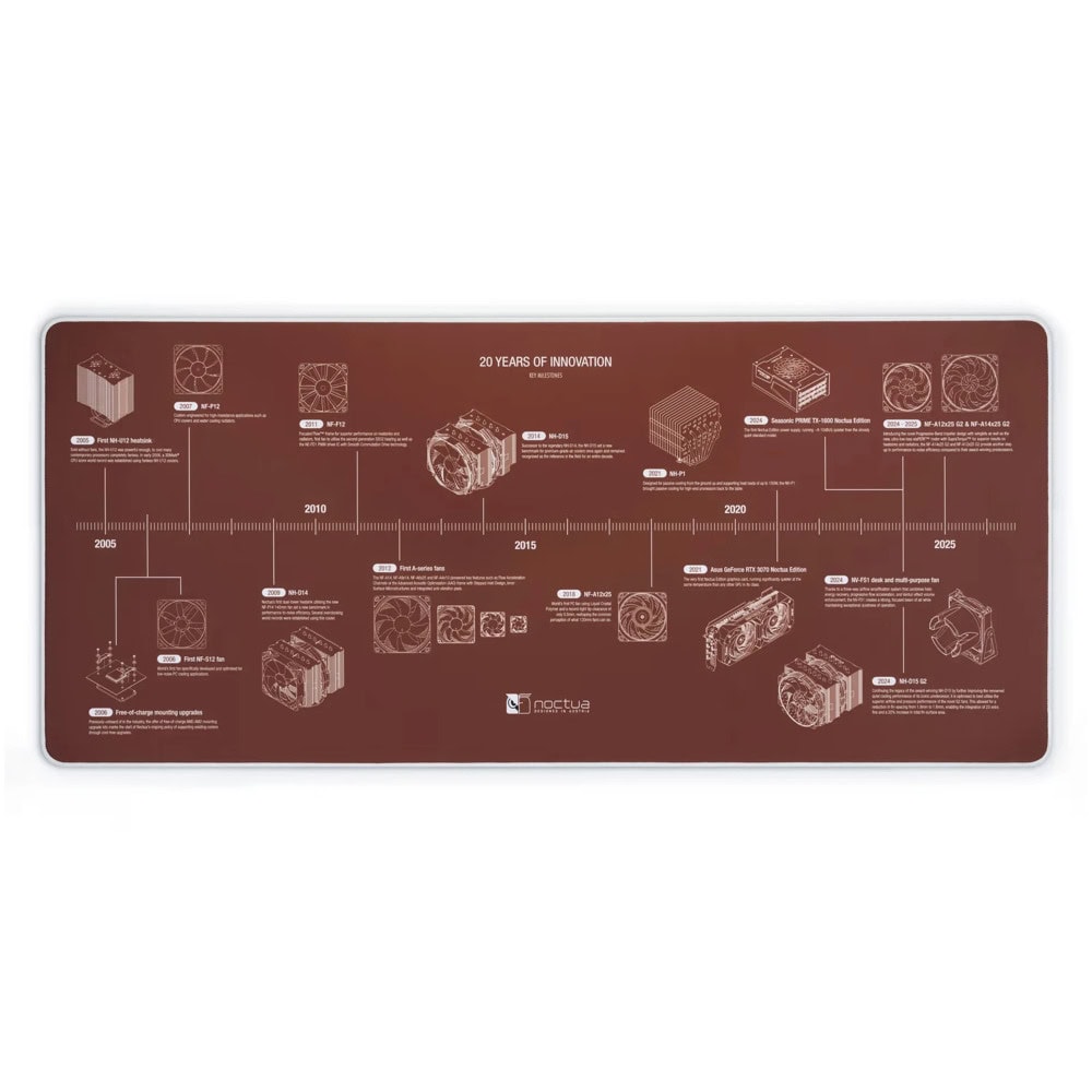 The NP-DM3 depicts key milestones during Noctua's history of innovation: Starting with the original NH-U12 heatsink and the first-gen NF-S12 fan, it spans a timeline from 2005 over later legends like the NF-P12 and NH-D14 and all the way to today's G2 models.