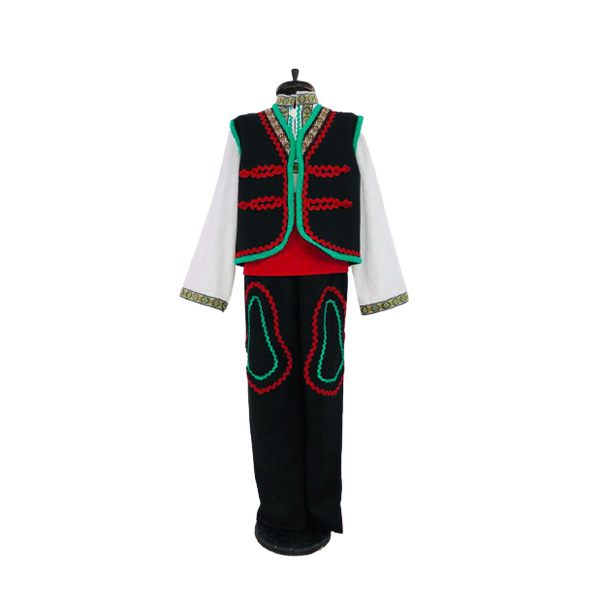 Мъжката народна носия се характеризира с бяла риза, вълнен елек или сако и широки панталони, често вълнени и цървули. Жилетката или сакото обикновено са украсени със сложни бродерии и метални копчета. Мъжете също носят калпак, често изработен от вълна или филц, украсен с цветна бродерия.