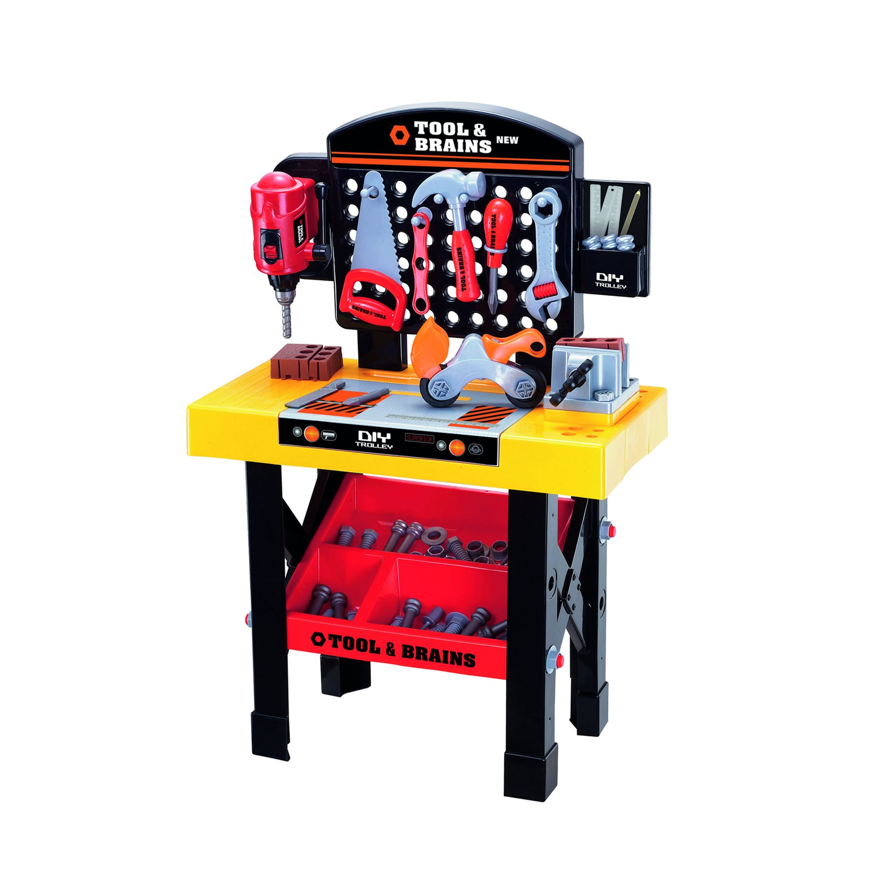 • Комплектът съдържа всички необходими инструменти за една работилница: чук, отвертка, клещи, триони, пластмасови винтове и пирони, ламели с дупки, тикове (общо 46 елемента).