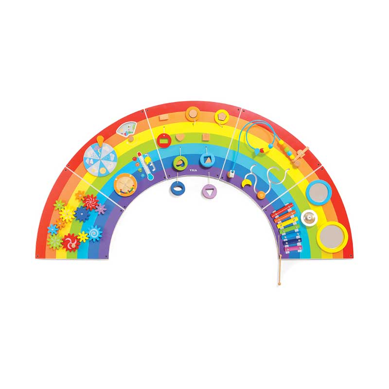 • Стенната манипулационна дъска Rainbow от пет части предлага богат набор от дейности, които подпомагат развитието на сетивата и ръчните умения при най-малките.