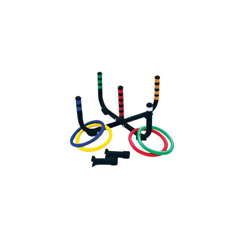 • Комплектът съдържа: 6 обръча, 2 стоманени скоби и метална стойка под формата на кръст с гумирано краче в долната част.