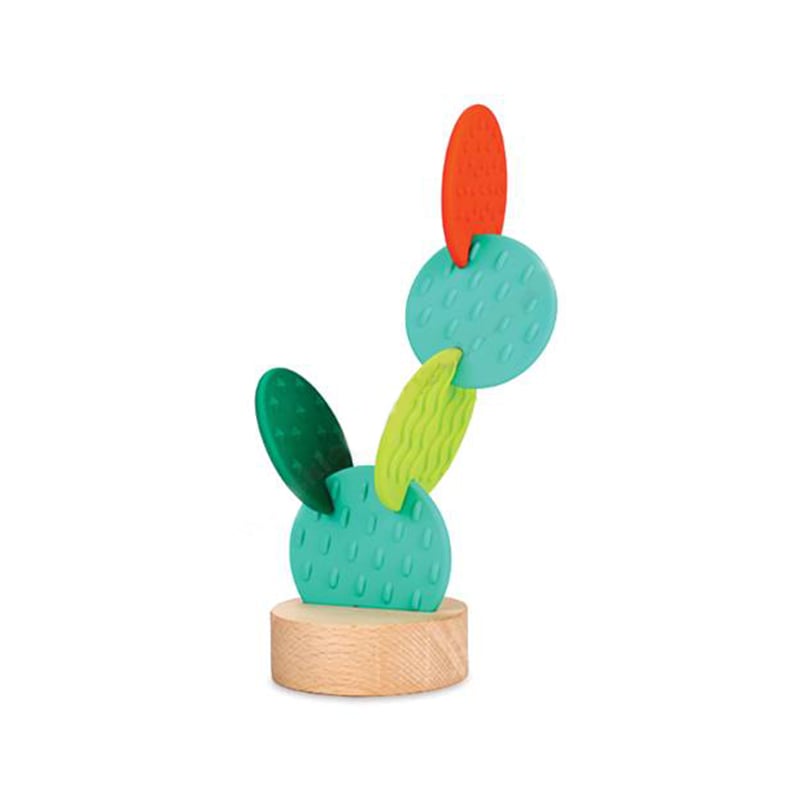 • Комплект силиконови рингове с дървена основа. Целта на играчката е да се създаде цветен кактус.