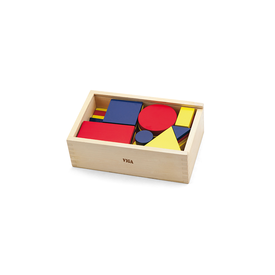 • Дървени блокчета, изобразяващи основни геометрични фигури.