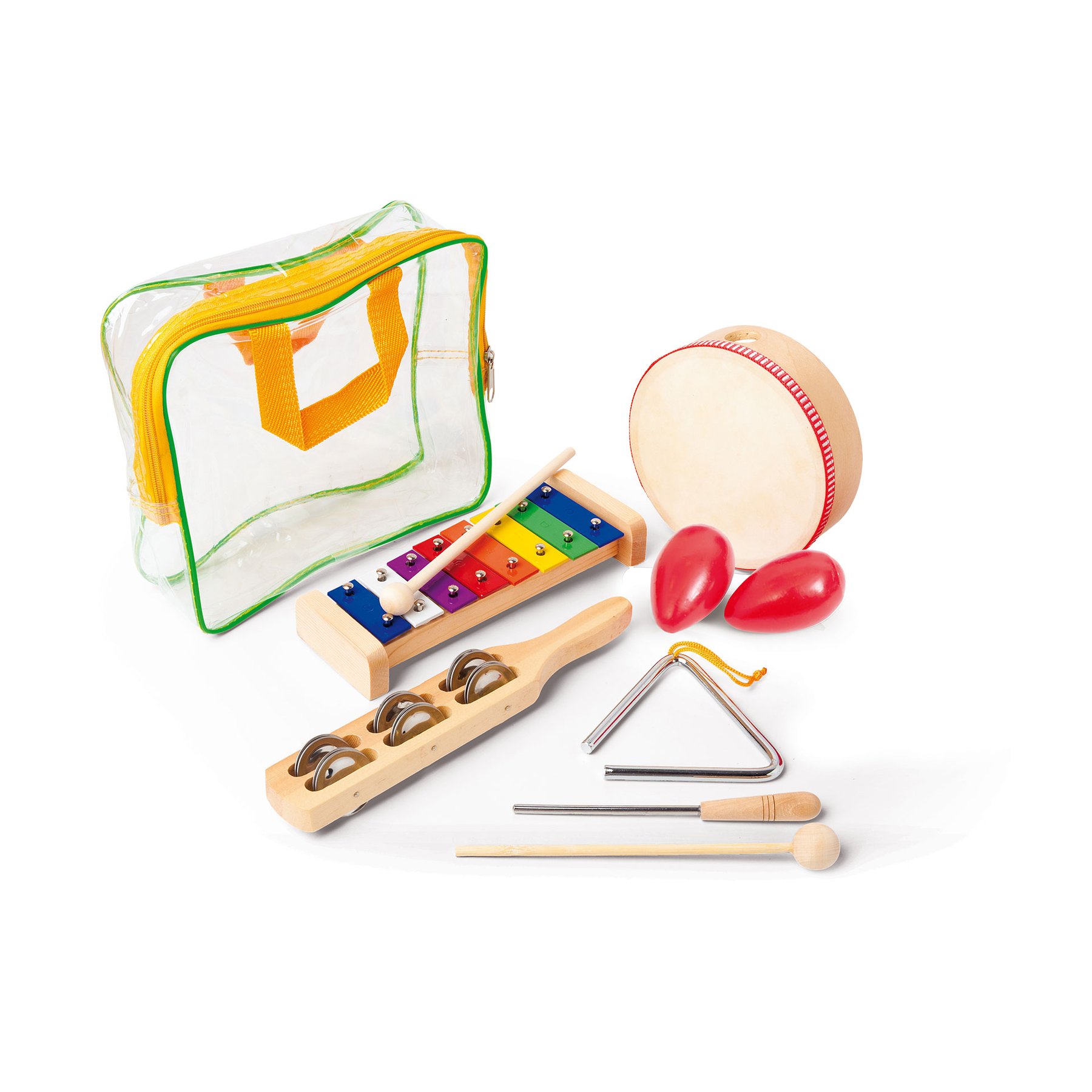 • Съдържание: дървен барабан (D 15 cm), камбани (L 22 cm), пластмасови маракаси (H 18 cm), триъгълник (H 10 cm) с пръчка (L 16 cm), 2 дървени барабанни пръчки (L 20 cm), чинели с дървени дръжки (L 25 см).