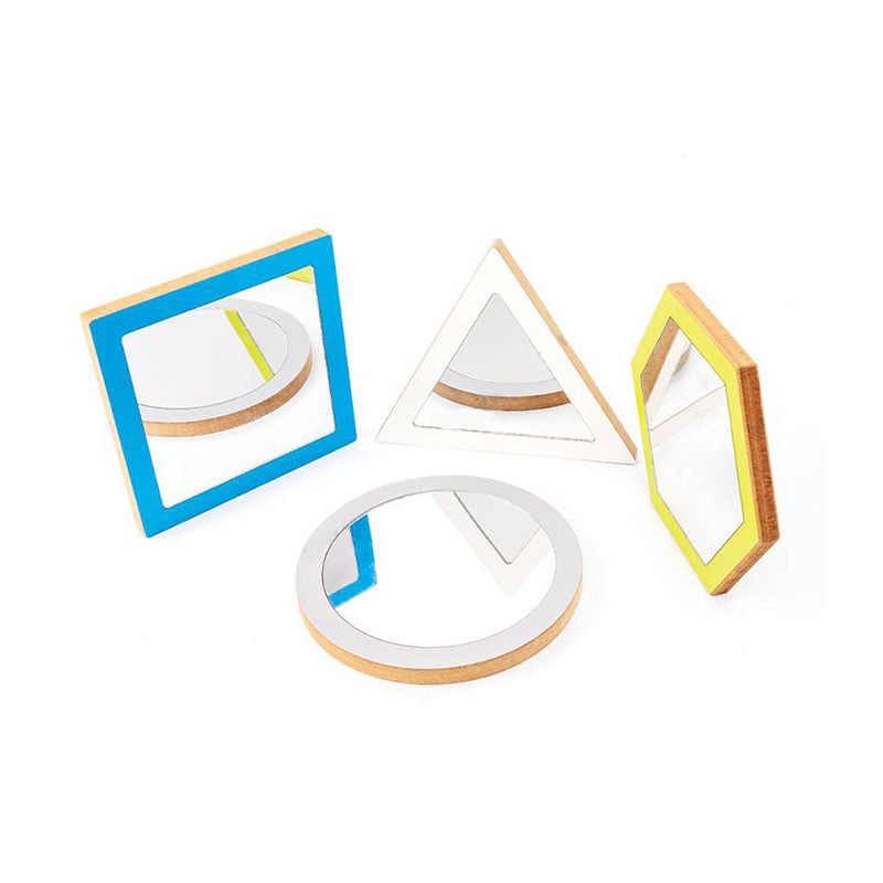 • Комплектът съдържа 4 броя огледала: кръгло, триъгълно, шестоъгълно и квадратно. Всяко от тях е оцветено в различен цвят.