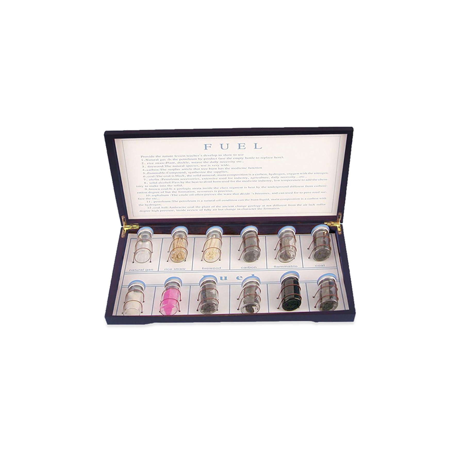 • В кутията са събрани мостри на горива, които се използват в днешно време.