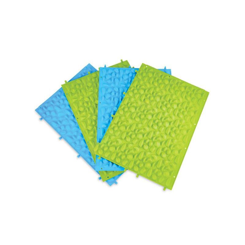 • Сетивната пътека с текстура под формата на малки неправилни камъчета е изградена от двуцветни, еластични и леки панели, които лесно се свързват благодарение на отворите и щракащите нитове, разположени по краищата на всеки елемент.