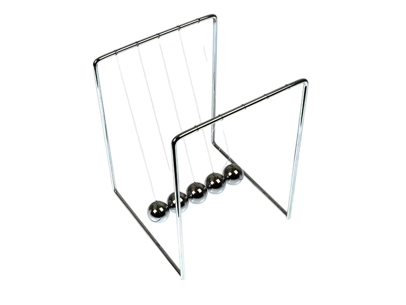• Редица от 5 еднакви стоманени топки в контакт една с друга, окачени на нишки, които могат да се люлеят само в една обща равнина. Когато една от тях бъде отклонена и освободена, ударът й върху останалите топки ще накара само последната топка да отскочи от противоположната страна на редицата. Нейното отклонение ще бъде почти идентично с тази на първата.