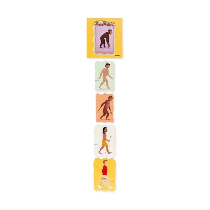 Децата не само развиват логическо мислене и фина моторика, но и добиват основни познания по биология и история. Подреждайки фигура след фигура, те наблюдават как се променя стойката, формата на тялото и характерните белези на хоминидите през вековете. Подходящ за занимания у дома, в училище или в образователни центрове.