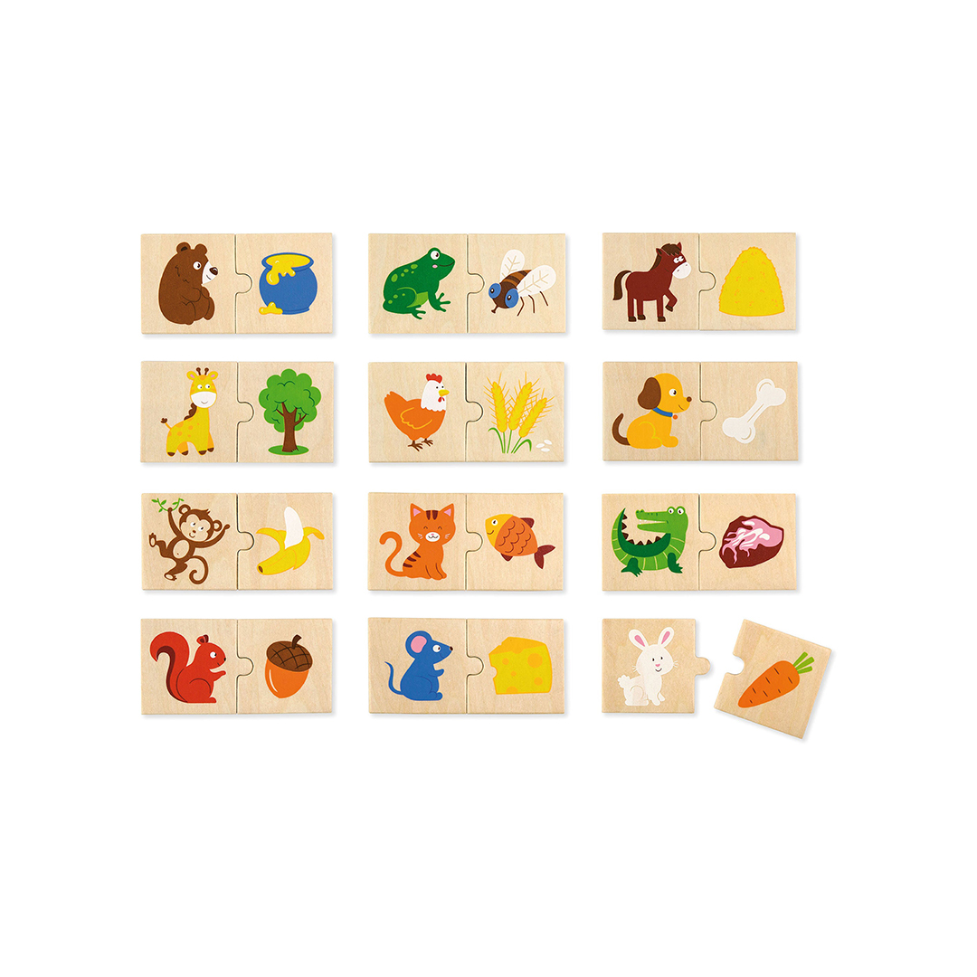 • Пъзел-комплект, от който можете да съставите 12 двойки картинки с животни и техните любими храни.
