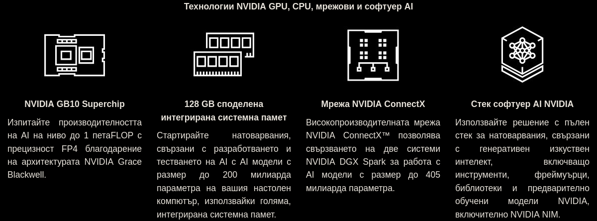 NVIDIA DGX Spark, задвижван от иновативния суперчип NVIDIA GB10 Grace Blackwell, е революционно решение, което предлага едно петаFLOP1 производителност на AI в компактна и енергийно ефективна форма. С вградения пакет софтуер NVIDIA AI и 128 GB памет, той представлява идеална среда за разработчици, които искат да създават, усъвършенстват и провеждат инференция на най-новите модели AI от реномирани компании като DeepSeek, Meta, NVIDIA, Google и Qwen. С възможността да поддържа модели с размер до 200 милиарда параметри локално, DGX Spark става незаменим инструмент в областта на изкуствения интелект, позволяващ откриването на нови хоризонти в технологията.