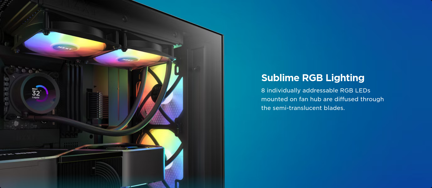- Eight Individually addressable LEDs mounted on the fan hub are perfectly diffused through the semi-translucent blades for a sublime lighting effect.