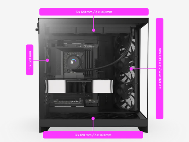 10-Fan Cooling Fits up to nine 140 mm fans and one 120 mm rear fan. | Large Radiator Support Holds up to 420 mm radiators on the top and front-right panels for versatile cooling. |