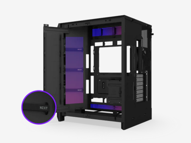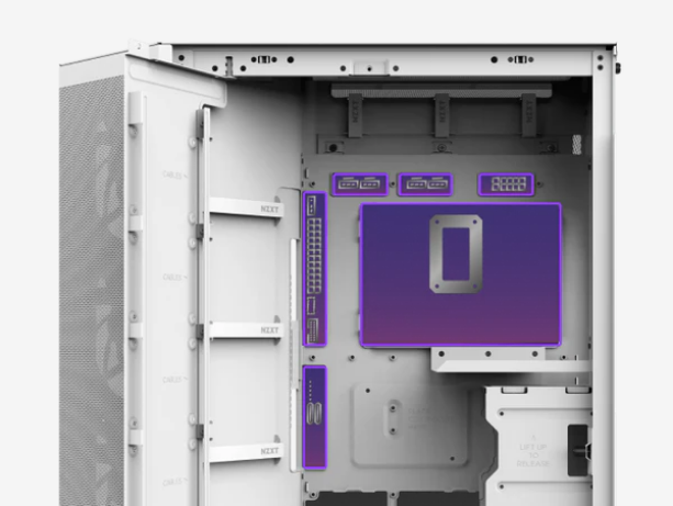 Back-Connect Ready Compatible with ASUS BTF and MSI Project Zero motherboards for a cable-free look. | Easy Cable Management Extra-wide channels, Velcro straps, and tie-down points make cable routing simple. |