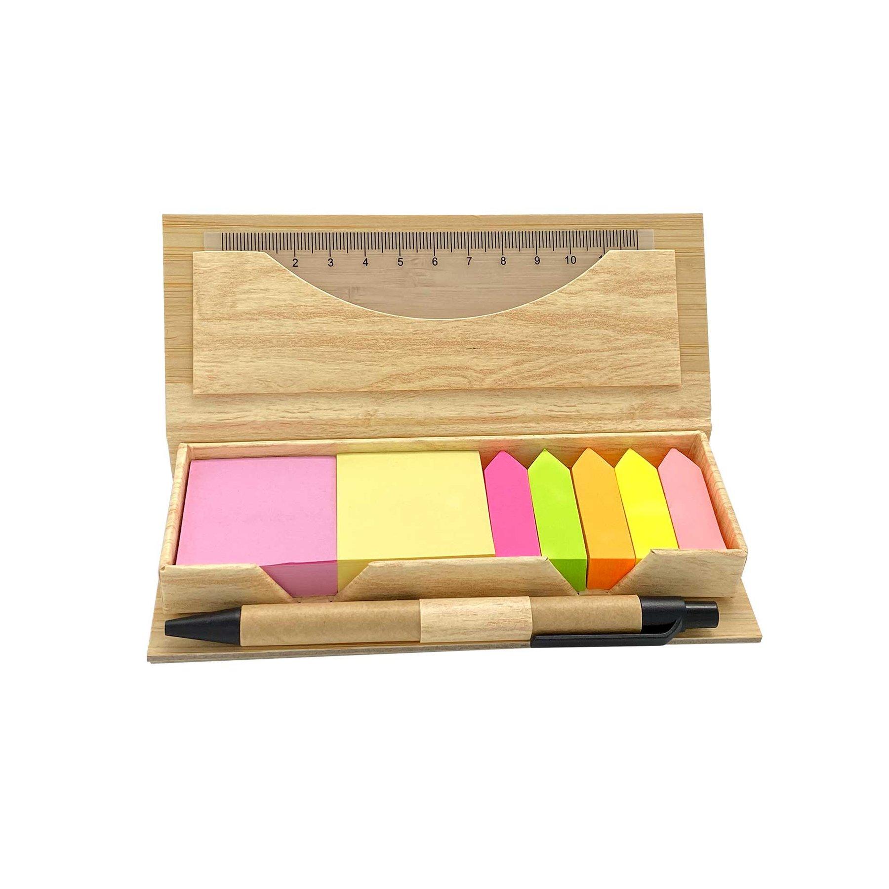 • Комплект, включващ листчета за записки, линия и химикалка, в елегантна бамбукова кутия.
