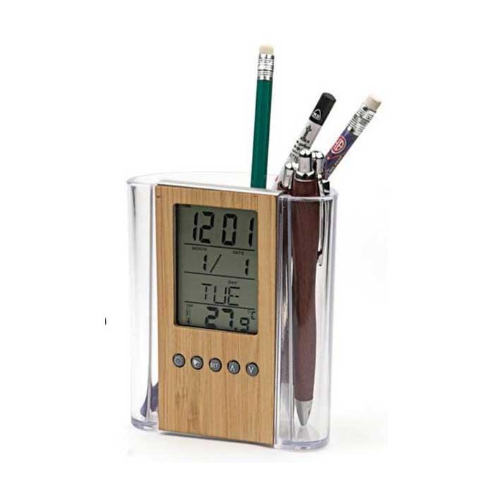 • Бамбуков електронен часовник с дисплей за температура и дата TOP, с включен държач за химикалка.