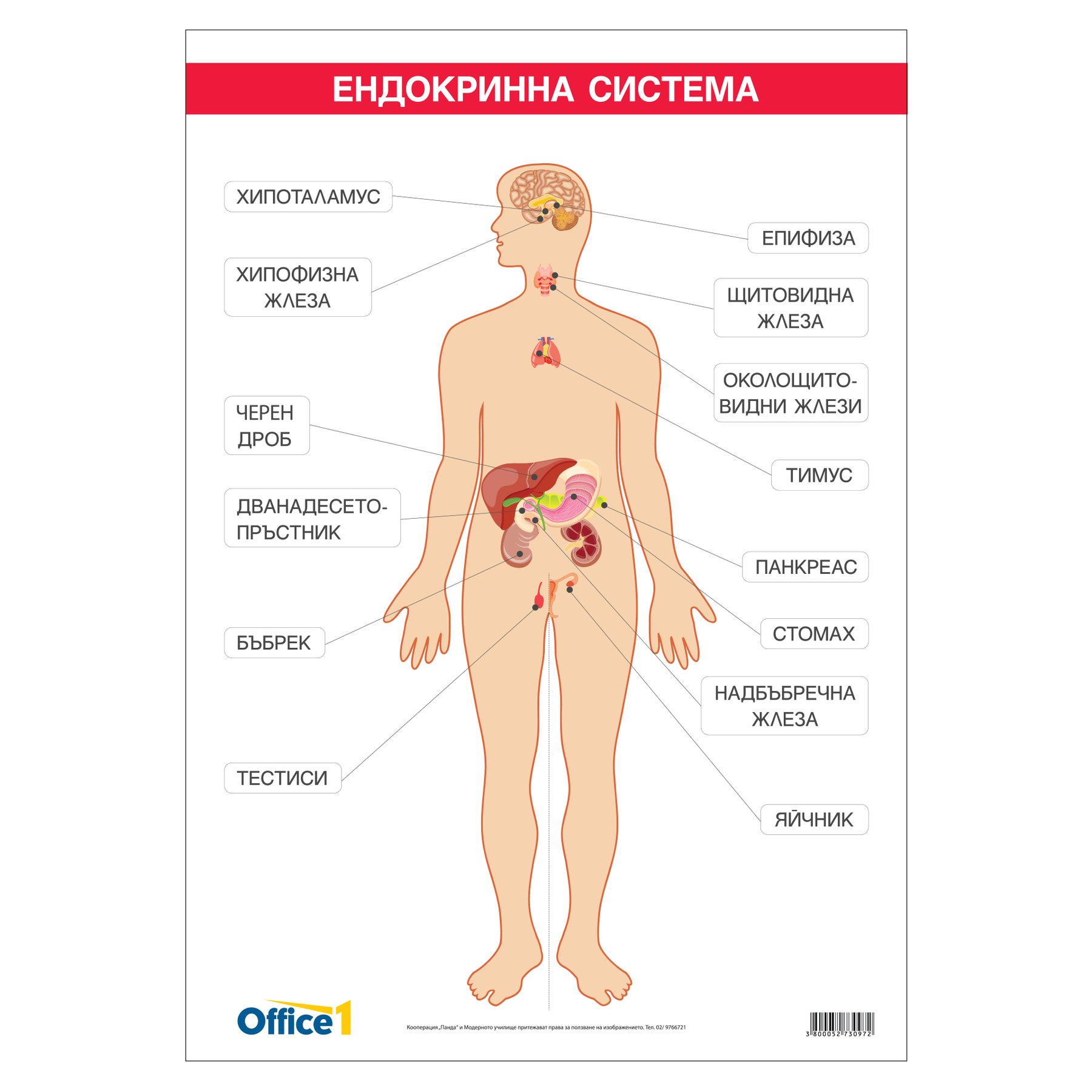 Office 1 Ученическо табло ''Ендокринна система'', 70 x 100 cm