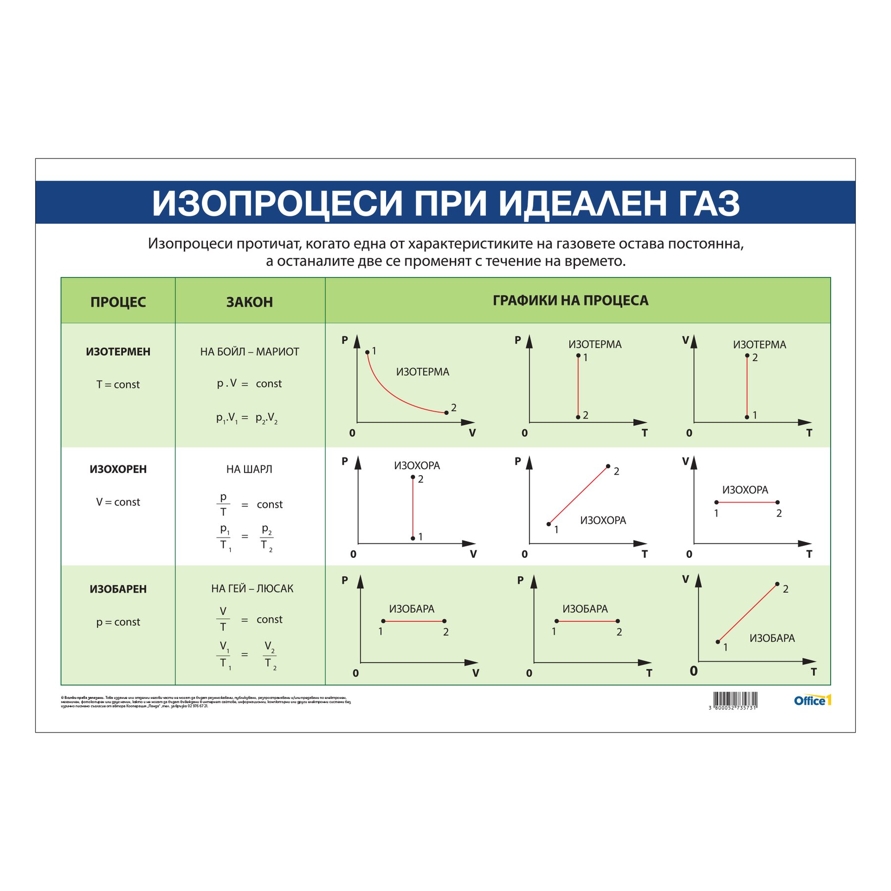 • В учебното табло „Изопроцеси при идеален газ“ са представени изотермен процес, изохорен процес и изобарен процес. Дадени са формулите, описващи законите на Бойл-Мариот, на Шарл и на Гей-Люсак. Първия принцип на Термодинамиката е записан и за трите изопроцеса при идеален газ.