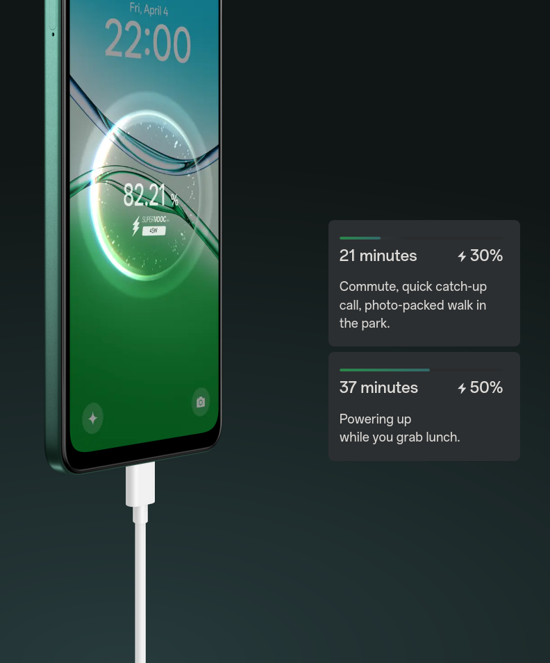 Get 30% battery in just 21 minutes—enough for a quick catch-up call, or a photo-packed walk in the park. Hit 50% in just over half an hour8, perfect for powering up while you grab lunch.