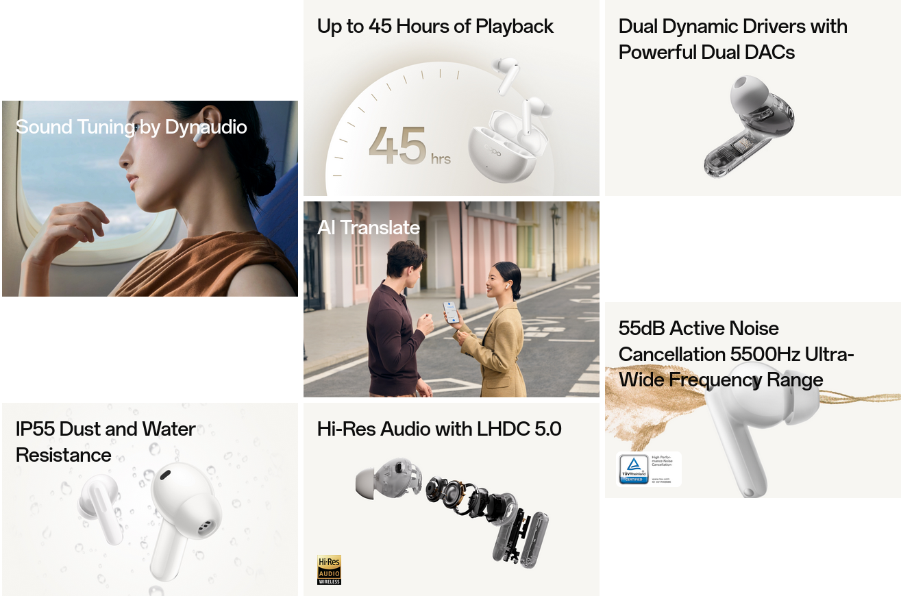 OPPO Enco X3s adopts a real-time action noise cancellation, boasting up to 55dB4 Active Noise Cancellation and an ultra-wide Frequency Range of 5500Hz5, delivering a broader-coverage noise cancellation experience. Simply putting them on, Earbuds become your easy switch to isolate yourself from the outside noisy world.