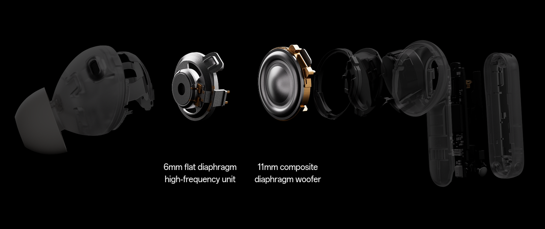Inspired by premium speaker systems, the high/low-frequency dual-driver crossover design features two independent dynamic drivers separately processing distinct frequency ranges. The system delivers crisp and nuanced treble for classical music, and resonant, expansive bass for pop genres. From rock ballads to soulful melodies, it delivers exceptional clarity and immersion across all music genres.