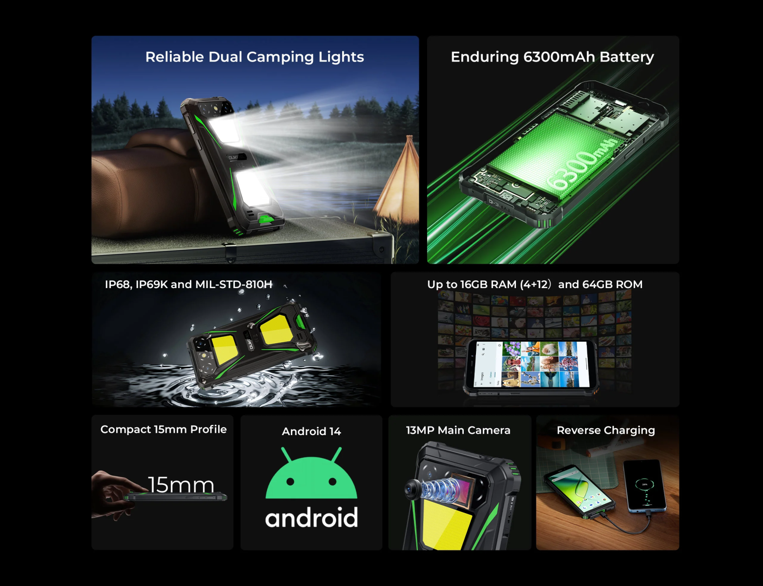 | Durability | IP68/IP69K water/dust resistant; high pressure jets; immersion up to 1.5m for 30 min; drop resistant 1.5m; MIL-STD-810H; dedicated flood flashlight |