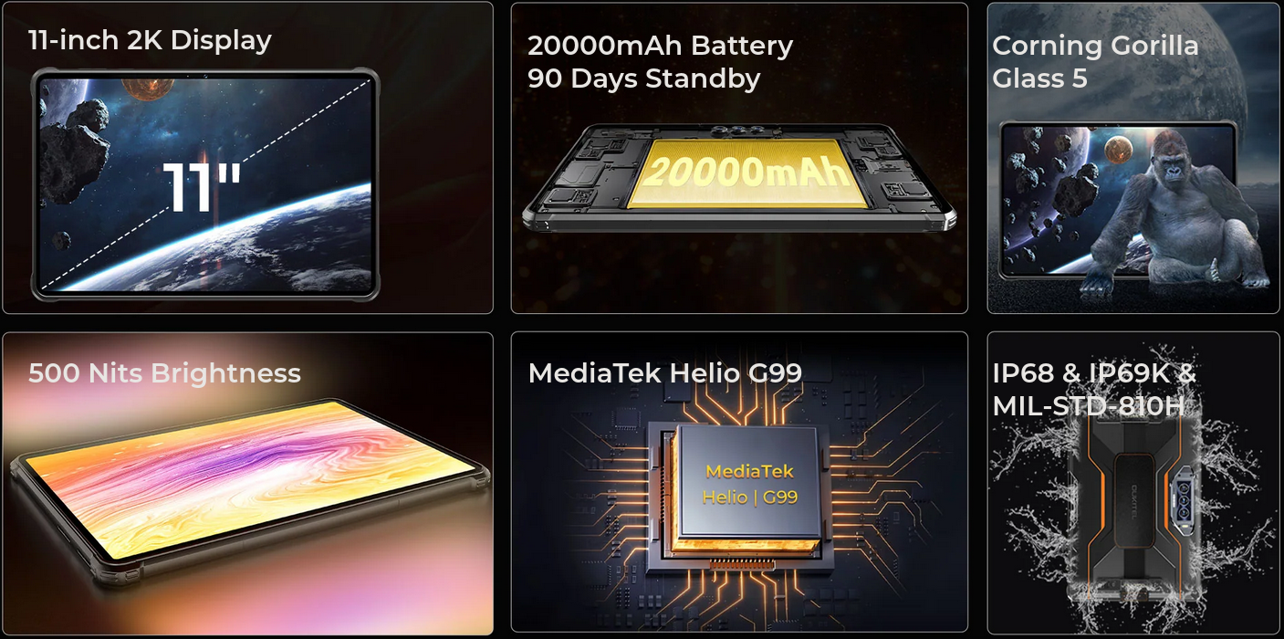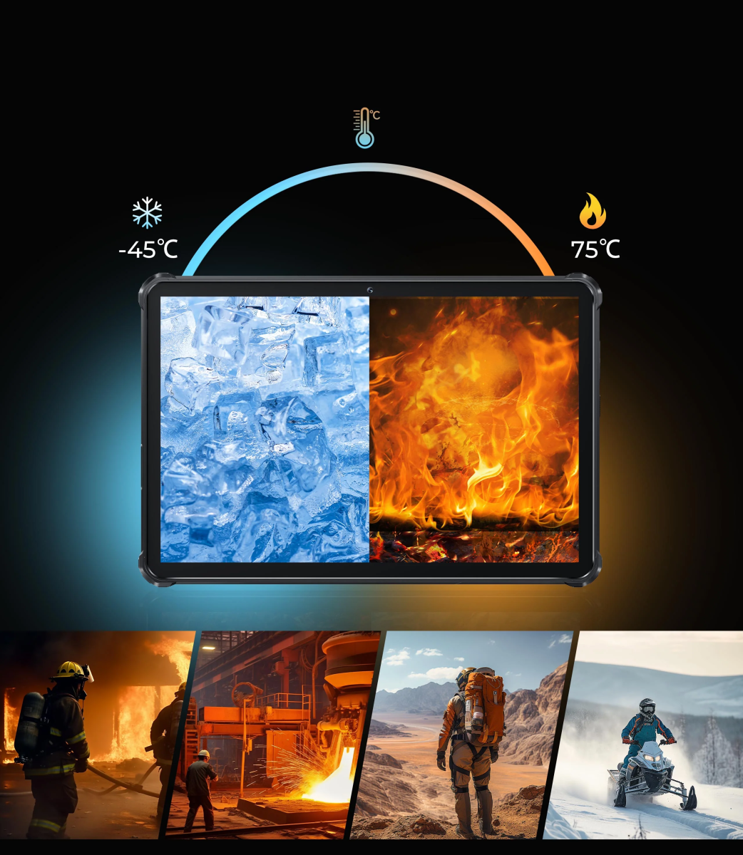 Built to withstand the harshest environments, the OUKITEL RT8 rugged tablet is IP68 and IP69K certified for the highest water and dust resistance and has passed MIL-STD-810H for military-grade drop resistance, ideal for construction, firefighting and trucking scenarios.