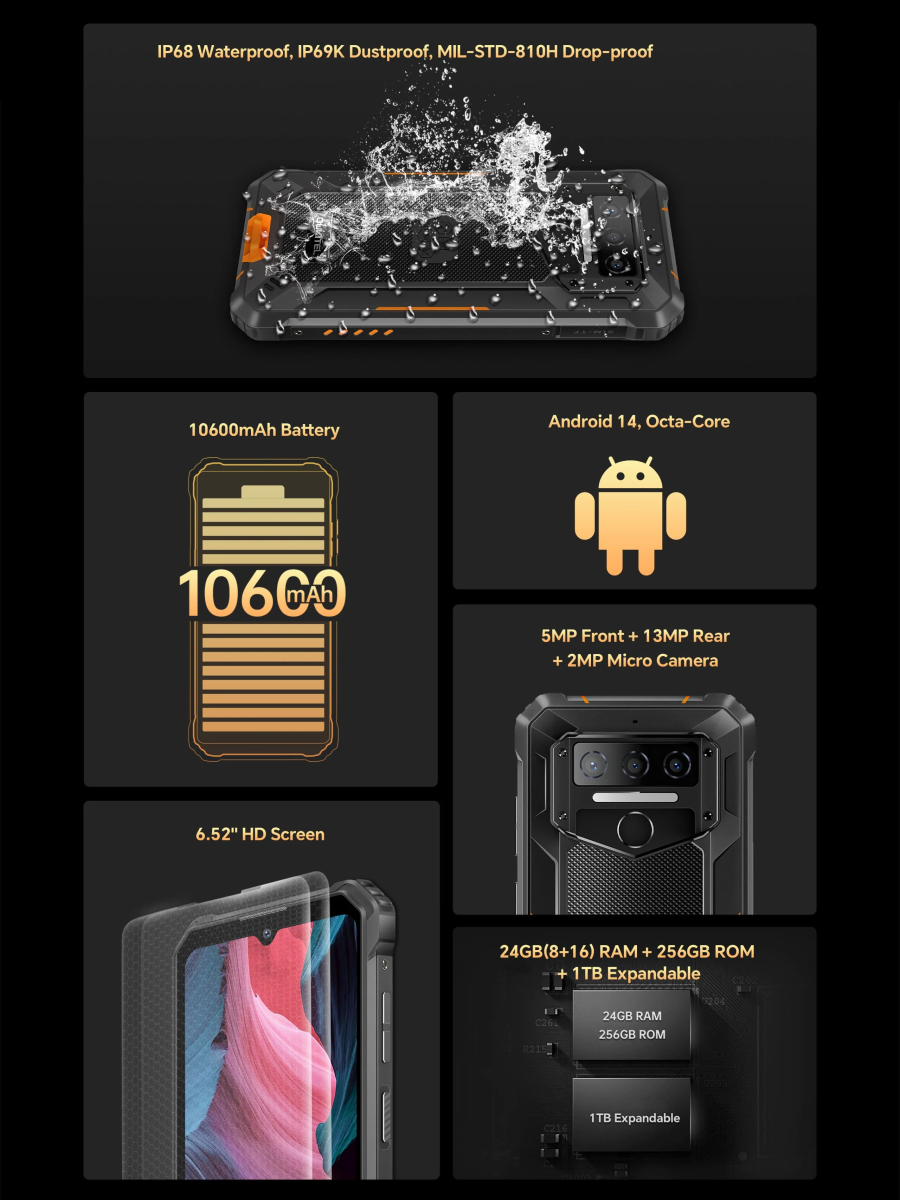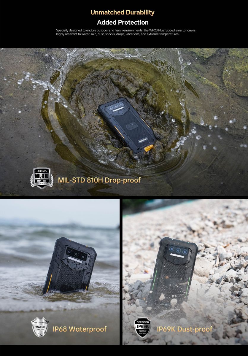 | Ruggedness | IP68/IP69K dust & water resistant (high-pressure water jets; immersible up to 1.5 m for 30 min); Drop resistant up to 1.5 m; MIL-STD-810H compliant |