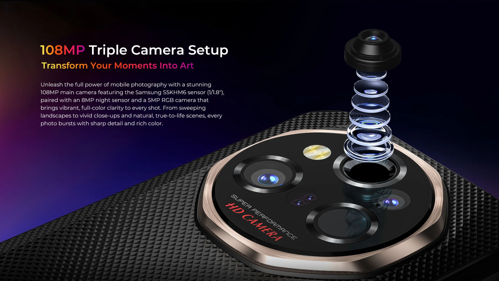 | Triple | 108 MP f/2.2 (wide), 1/1.8", PDAF • 8 MP f/2.2 (night vision), 1/1.78", AF • 5 MP f/2.2 (thermal), 1/1.5" |