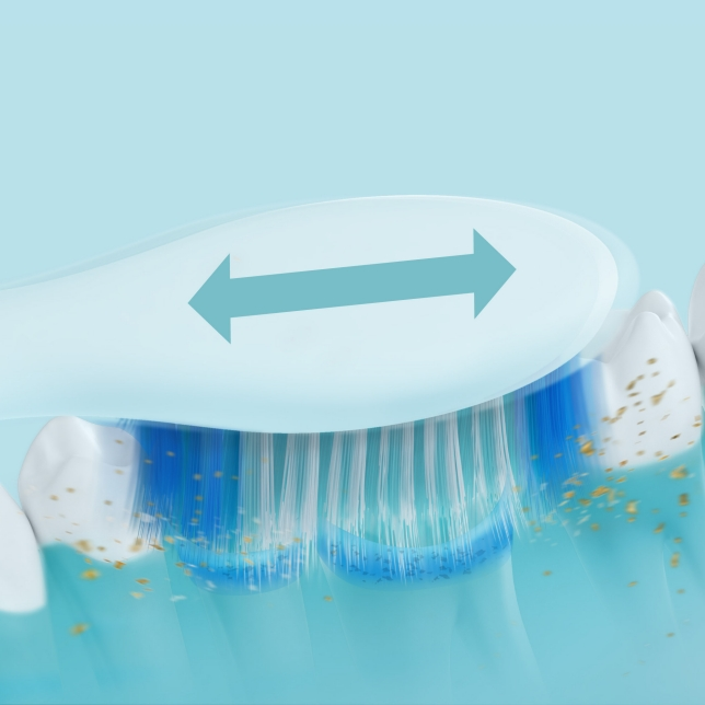 Хоризонталното движение на четката ефективно изчетква плаката Електрическата четка за зъби Panasonic EW-DC12 използва високоскоростни движения на четката по линията на венците, за да достигне по-дълбоко в пародонталните джобове за ефективно изстъргване на плаката и бактериите. | |