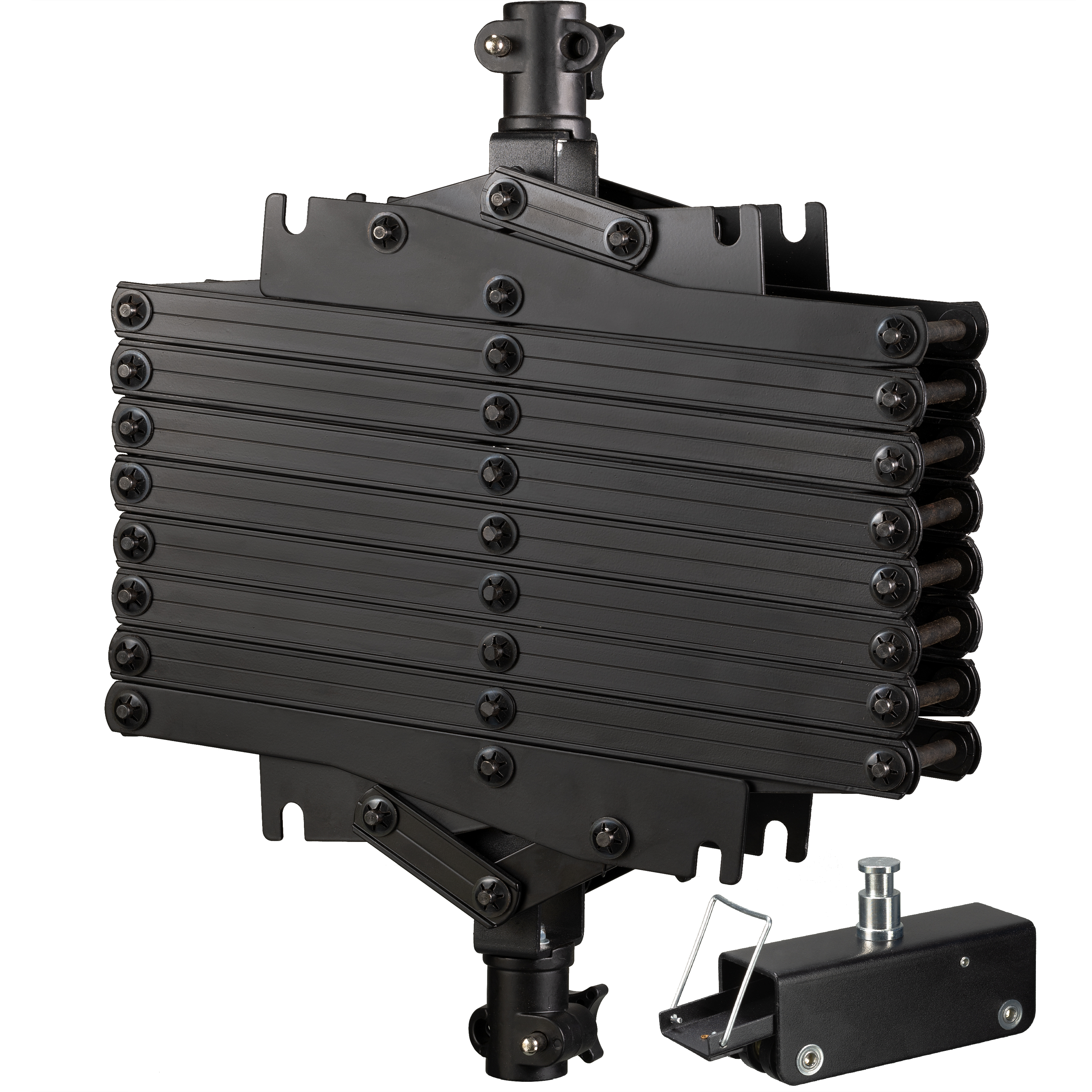 Photo studio equipment, photo studio flashes, photo studio daylight lamps and also LED lights and panel lights are attached to the pantograph with an extension range of 40 - 200 cm using the spigot adapter included in the scope of delivery.