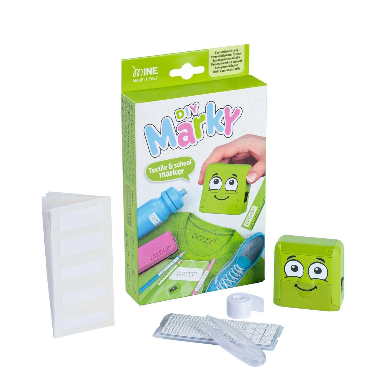 • Комплектът съдържа: печат MARKY, 1 m текстилна лента за лепене с ютия, 20 етикета, пинсета, букви на кирилица и символи.