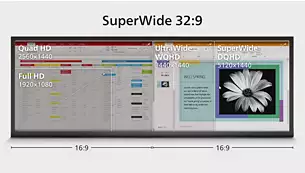 32:9 SuperWide screen designed to replace multiscreen setups32:9 SuperWide 49" screen, with 5120 x 1440 resolution, is designed to replace multiscreen setups for massive wide view. It's like having two 27" 16:9 Quad HD displays side-by-side. SuperWide monitors offer screen area of dual monitors without the complicated setup. | ![]() |